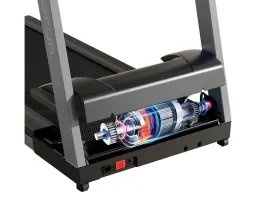 Тренажер оснащен поднимающимися ручками для бега на высокой скорости. Для комфорта предусмотрены подставка под планшет, два держателя для бутылки и мелких вещей, а также компенсаторы неровностей пола. Рама изготовлена из легированной стали, что гарантирует устойчивость и долговечность конструкции.