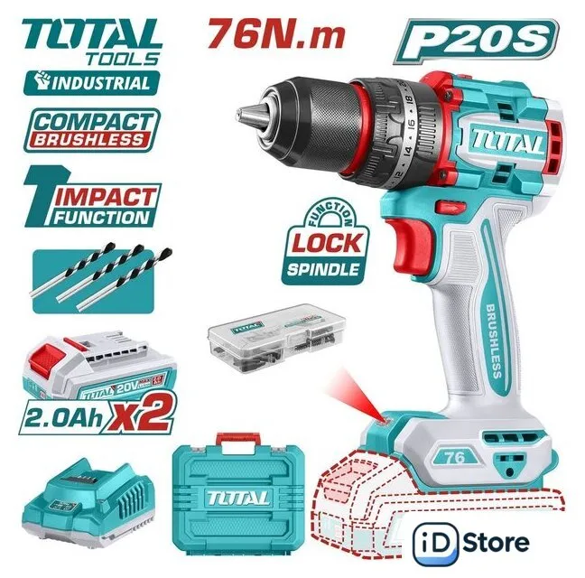 Ударная дрель-шуруповерт Total TIDLI20768 (с 2-мя АКБ, кейс)