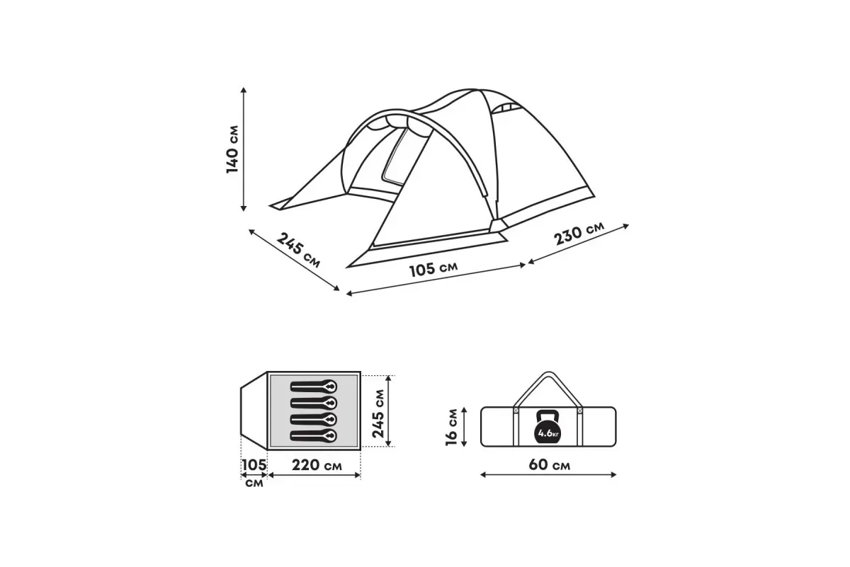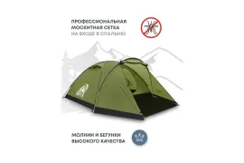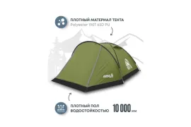 Тент выполнен из полиэстера 190T 63D с водонепроницаемостью 3000 мм и огнезадерживающей пропиткой. Дно изготовлено из армированного полиэтилена (терпаулинга) с водонепроницаемостью 10000 мм. Каркас собран из фиберглассовых дуг с металлическими наконечниками. В комплекте предусмотрены штормовые оттяжки и колышки для крепления при сильном ветре.