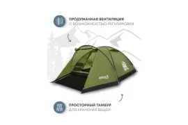 На входе расположен просторный тамбур с дополнительной дугой для увеличения объема и съемным полом в комплекте. Отличительной особенностью являются большие вентиляционные окна с двух сторон, оснащенные опорами для регулировки потока воздуха.