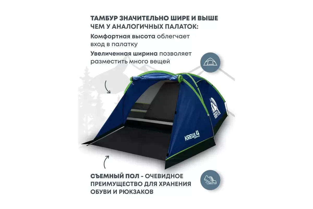 Палатка RSP Krewl 4 — четырехместная трекинговая модель для походов и семейного отдыха на природе. Благодаря небольшому весу и компактным размерам в сложенном виде она подходит для пеших походов, велосипедных и мотоциклетных путешествий.