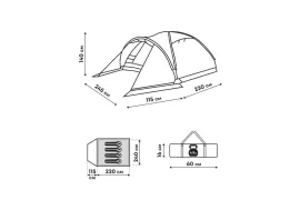 Тент выполнен из полиэстера 190T 63D с водонепроницаемостью 3000 мм и огнезадерживающей пропиткой. Дно изготовлено из армированного полиэтилена (терпаулинга) с водонепроницаемостью 10000 мм. Каркас собран из фиберглассовых дуг с металлическими наконечниками. В комплекте предусмотрены штормовые оттяжки и колышки для крепления при сильном ветре.