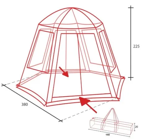 Инновационная система FASTBERG позволяет мгновенно собрать шатер. Входы и окна продублированы москитными сетками. По периметру пришита специальная «юбка» для защиты от ветра, влаги и насекомых. Штормовые оттяжки прошиты светоотражающей нитью.