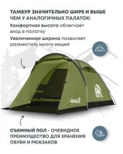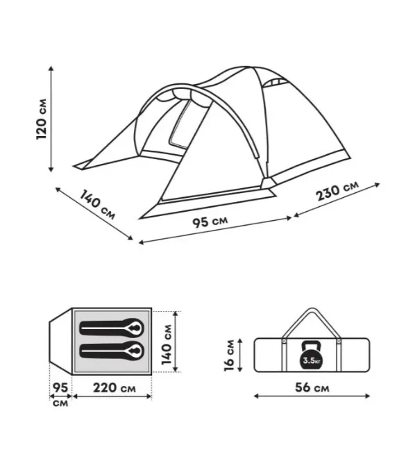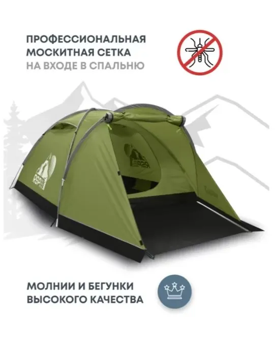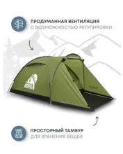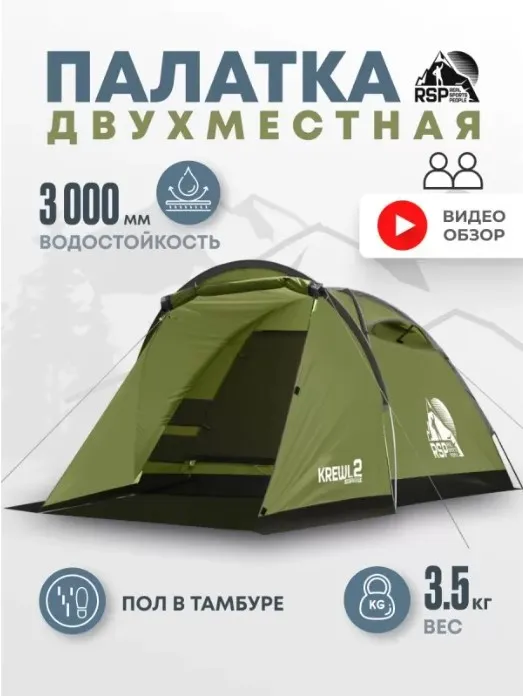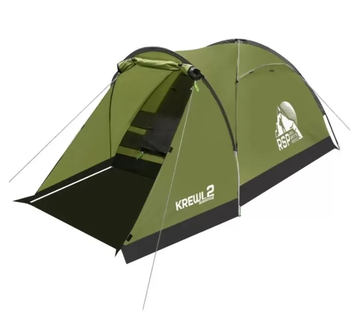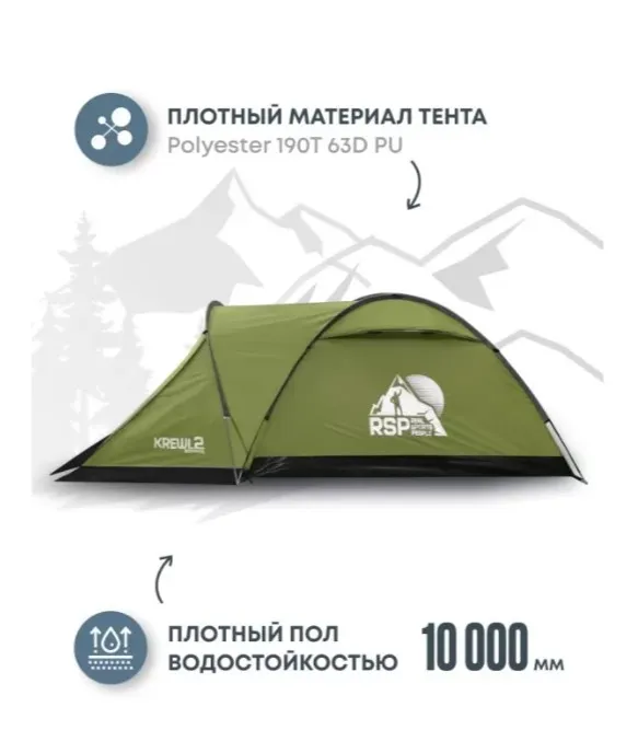 RSP Krewl 2 в оливково-зелёном цвете — это однослойная треккинговая палатка на двоих с тамбуром и большими вентиляционными окнами. Модель заточена под конкретный сценарий: походы и выезды на двоих, где важен тамбур и усиленная вентиляция в однослойной схеме. Тент выполнен из полиэстера 190T 63D PU (3000 мм), дно — из терпаулинга (10000 мм), каркас — фибергласс (дуги 7,9 мм). Сборка классическая, без автоматики — простая и ремонтопригодная. Один вход и тамбур спереди позволяют удобно оставить обувь и снаряжение, не занося их в спальник. Проветривание идёт через дверь, москитные сетки и верхнюю вентиляцию. Внутри есть карманы и крючок для фонаря. Вес палатки — 3,5 кг, размер в сложенном виде — 56x16x16 см, спальное отделение — 220x140 см. Это прагматичный вариант для тех, кому нужна не «универсальная», а понятная и предсказуемая палатка под свой формат отдыха.Бренд: RSP