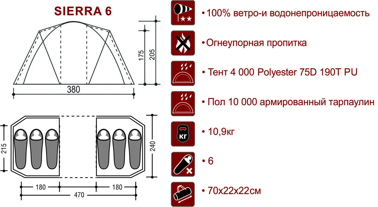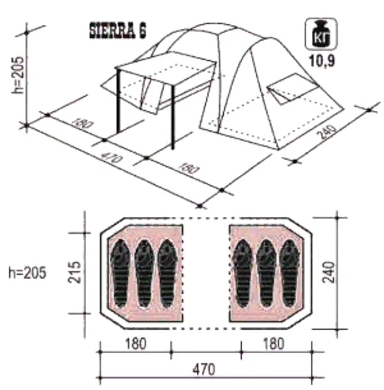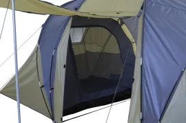 Кемпинговая шестиместная палатка с двумя спальнями и большим тамбуром между ними — решение для тех, кто ценит раздельные зоны для сна и общее пространство. Спальни сделаны подвесными: если нужно, одну или обе можно снять, и тогда на их месте освободится обширный зал для большой компании. Несмотря на внушительные размеры, палатка хорошо держит ветер и не подводит в непогоду.