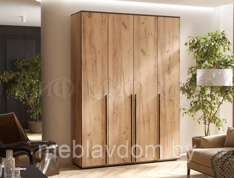 Шкаф из коллекции "Норд" с четырьмя дверцами представлен в трех стильных цветовых решениях: Дуб крафт, Дуб крафт белый и Графит. Эти утонченные и современные оттенки идеально впишутся в любой интерьер. Фасад шкафа отличается простотой и элегантностью, а четыре черные металлические ручки добавляют ему изысканности и создают приятный контраст. В центральной части шкафа расположена широкая штанга для одежды на плечиках, что позволяет сохранить вещи в идеальном состоянии. По бокам находятся удобные полки, подходящие для хранения обуви, аксессуаров и других предметов. Дверцы открываются мягко благодаря накладным петлям. Модуль устанавливается на черные опоры. Независимо от того, где вы разместите этот шкаф — в гостиной, прихожей или спальне — он станет важной частью вашего интерьера, придавая ему гармонию и стиль. Не упустите возможность приобрести этот великолепный четырехдверный шкаф из коллекции "Норд" и улучшить Ваш дом. Он станет не только практичным элементом для хранения, но и настоящим украшением, подчеркивающим элегантность и изысканность вашего жилища.