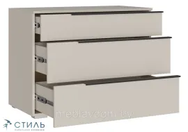 Комод имеет черные пластиковые ручки. Его ножки возвышаются на 20 мм над полом. Направляющие рассчитаны на нагрузку до 25 кг, включая вес ящика. Размеры внутреннего пространства верхнего ящика составляют 809х106х368 мм, а второго и третьего — 809х170х368 мм.