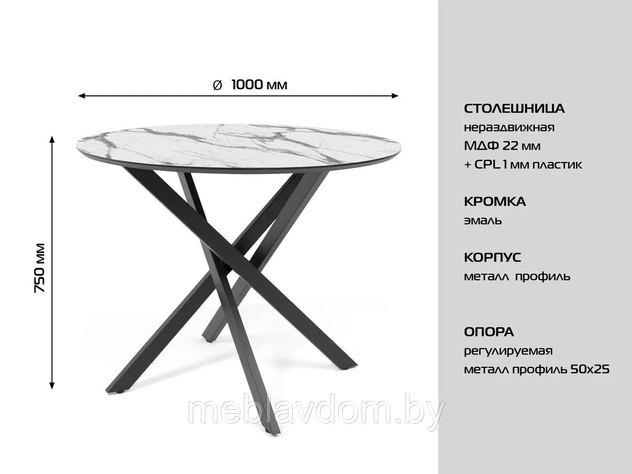 Ножки: изготовлены из прочного металла и окрашены в глубокий чёрный цвет. Уникальная конструкция с перекрёстным расположением опор придаёт столу современный вид и обеспечивает отличную устойчивость.