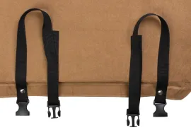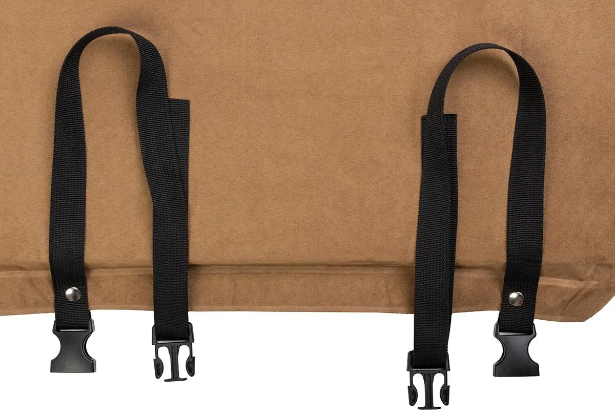 Размеры: 188×65×5 см, в чехле — 66×18 см. Вес: 2,0 кг. Нагрузка до 140 кг. Верх — Suede Polyester с водоотталкивающим покрытием. Дно — высокопрочная ткань с антискользящими резиновыми точками и влагоотталкивающей пропиткой. Наполнитель — вспененный полиуретан для равномерной поддержки и теплоизоляции.